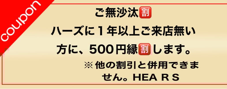 ご無沙汰・クーポン技術メニューを500円ご縁割引します。
